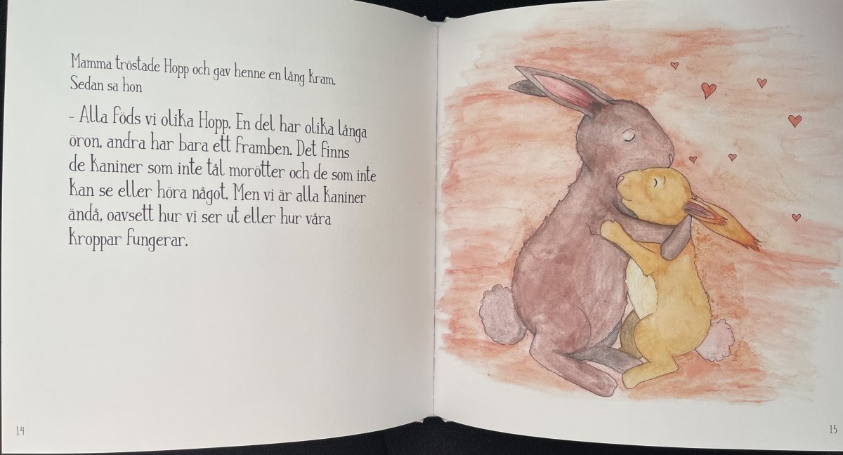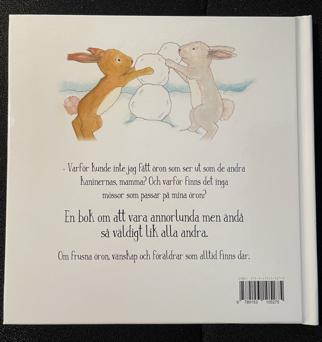 Boken handlar om kaninen Hopp, som fått öron som inte ser ut som de andra kaninernas öron. Varför finns det inga mössor som passar kaninen Hopps öron? Det är en fin berättelse om att vara annorlunda, men ändå så väldigt lik alla andra. Den handlar om frusna öron, vänskap coh föräldrar, som alltid finns där.